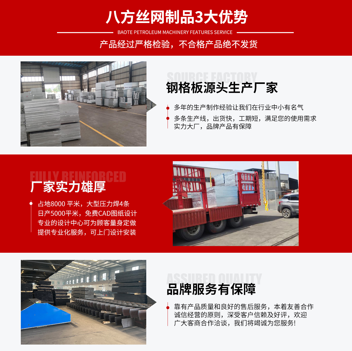 我公司是專業(yè)從事研發(fā)、制造、銷售:鋼格板(鋼格柵板)、鍍鋅鋼格板、密型鋼格板、不銹鋼鋼格板、玻璃鋼格柵、復(fù)合鋼格板、樹(shù)池蓋、溝蓋板、插接鋼格板、平臺(tái)鋼格板、特殊格柵板、踏步板、鍍鋅鋼格板等,產(chǎn)品適用于化工、港...